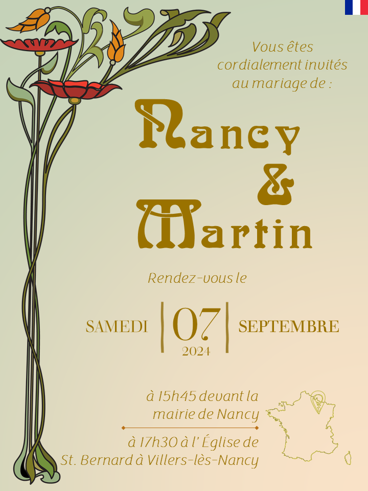 Lors de votre réservation, n’oubliez pas de mentionner le mariage de Nancy et Martin, car vous bénéficierez d’une réduction sur le prix de la chambre.