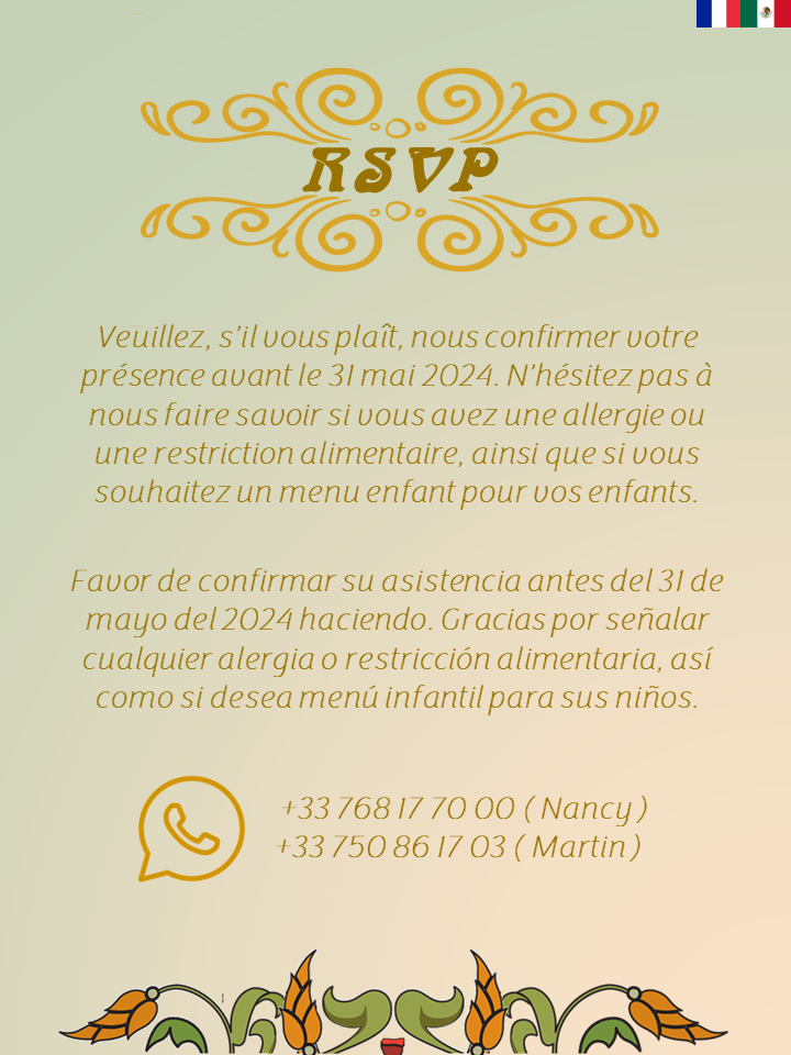 🔸Sus hijos son bienvenidos, sólo tiene que decirnos antes del 31 de mayo del 2024, si prefiere un menú infantil o un menú « normal ». 🔸También necesitaremos saber el número de niños para evaluar si vamos a contratar a una niñera o no.